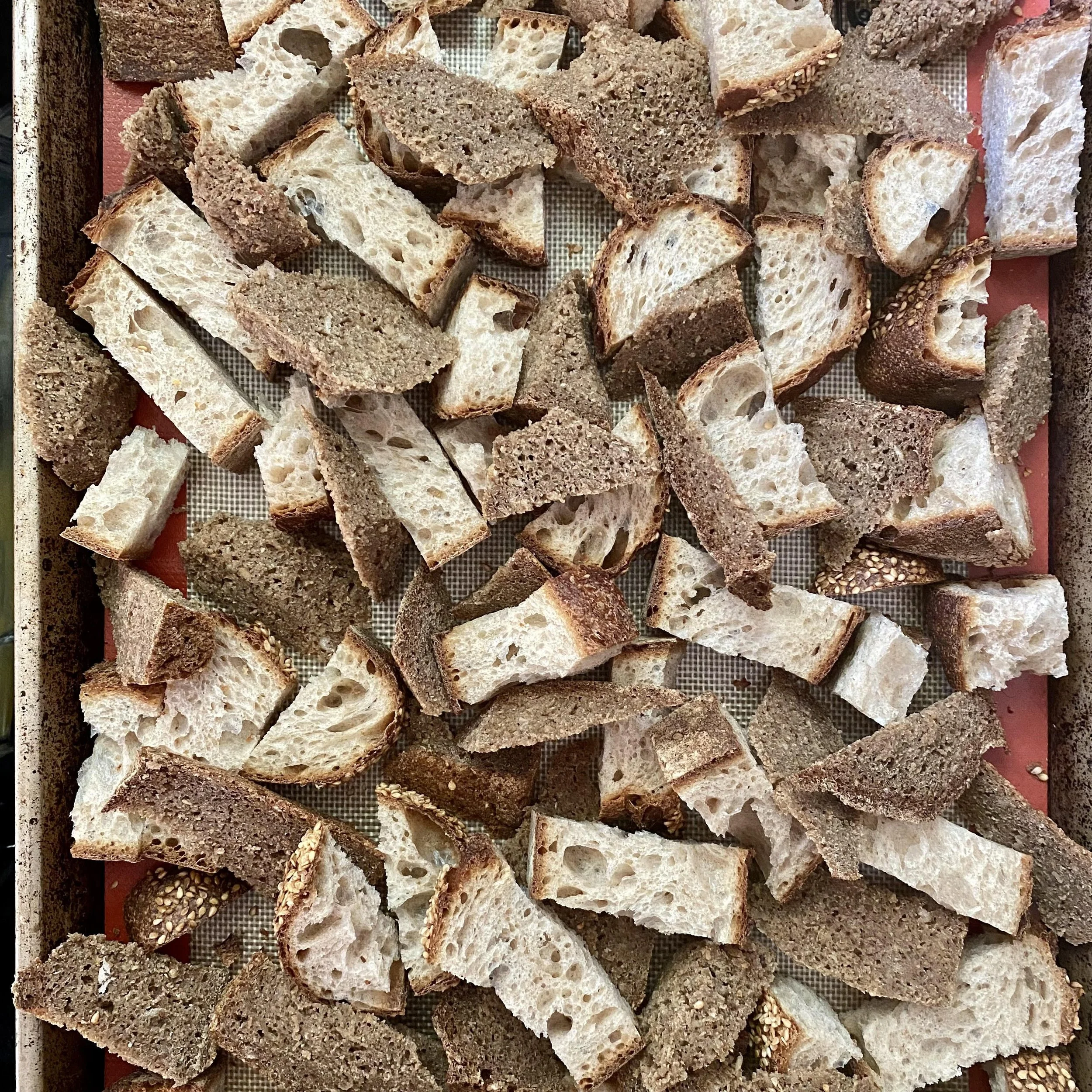Add the toasted bread and fold until the bread has absorbed all the butter.