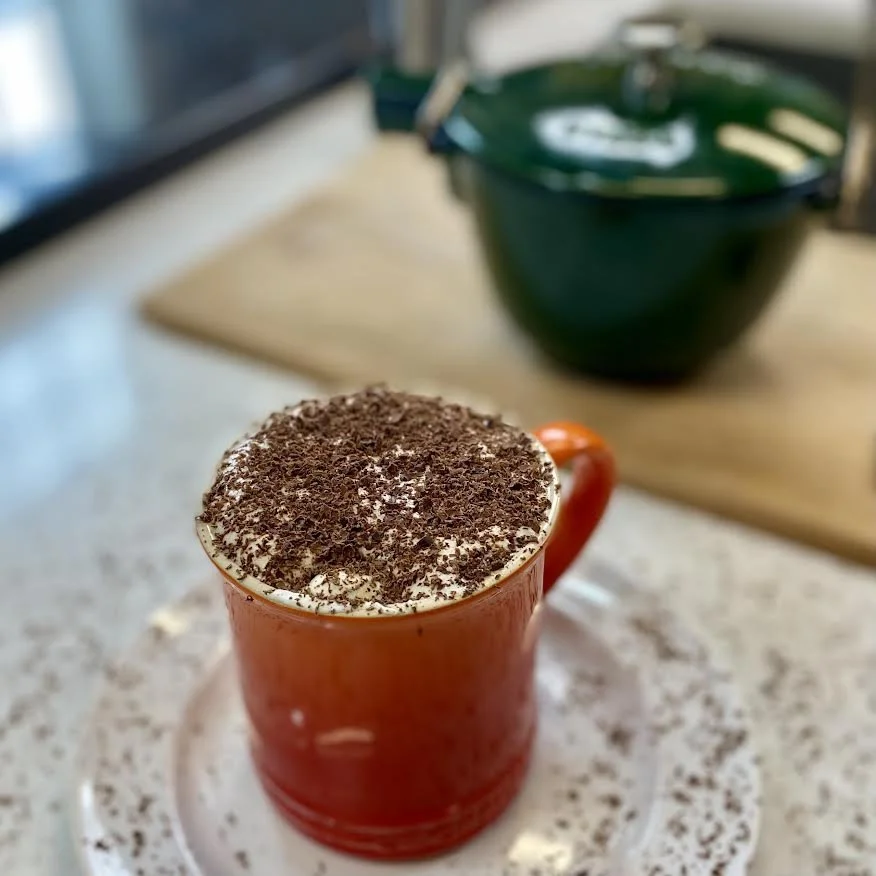 To enjoy after dinner--or really anytime the dreaded Pumpkin Spice in Everything season hits. Maggie created a drink that uses warming spices like star anise and clove in the coffee then is topped with fresh cream and chocolate shavings.